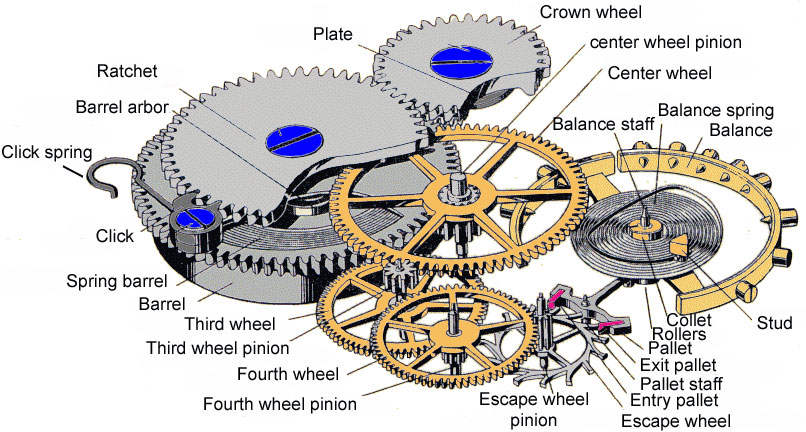 En mode très résumé, une méca c’est une chaîne : énergie → train → échappement → balancier → indication.